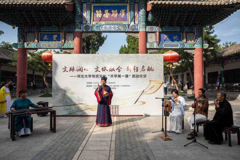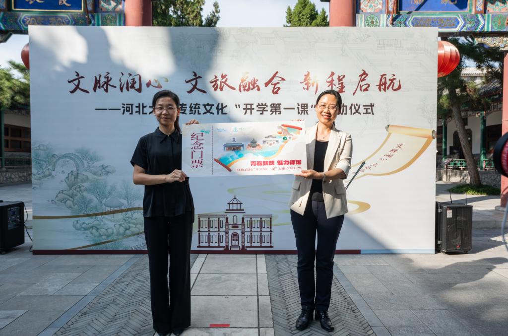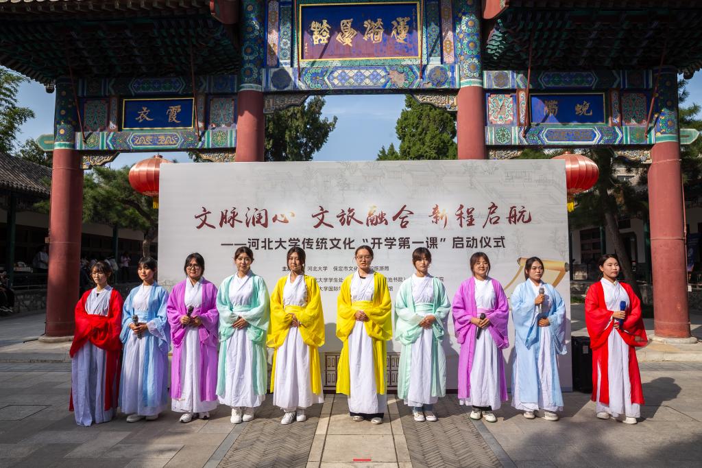 9月25日下午,“文脉润心 文旅融合 新程启航”河北大学传统文化“开学第一课”启动仪式在莲池书院举行。党委常委、副校长梁巍,保定市文化广电和旅游局局长赵胜男出席活动。国际学院2025级200余名学生,学生处、莲池书院、国际学院负责同志参加活动。