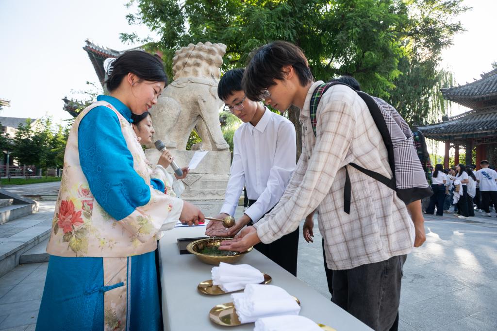 随后,开学古礼仪式在陶埙古调、《流水》琴韵、《诗经》《劝学》的琅琅诵读声中正式启动。国际学院200余名学生按照古礼分别进行静心、正衣、明志、誓词等环节,并实地参观了莲池书院,参与非遗展示、拓印体验等互动活动。