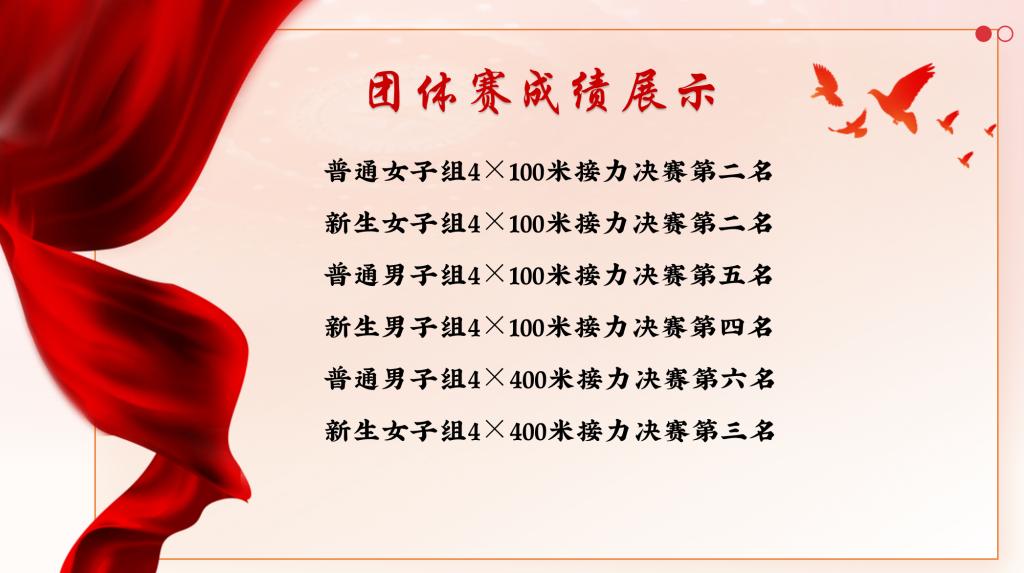 在全体师生的共同努力下,国际学院取得了河北大学运动会团体总分第三名的好成绩,其中获新生组群体项目团体总分第三名,普通组团体项目团体总分第三名,新生男子组田径项目团体总分第四名,新生女子组田径项目团体总分第二名,普通男子组田径项目团体总分第五名,普通女子组田径项目团体总分第六名,以及体育道德风尚奖。