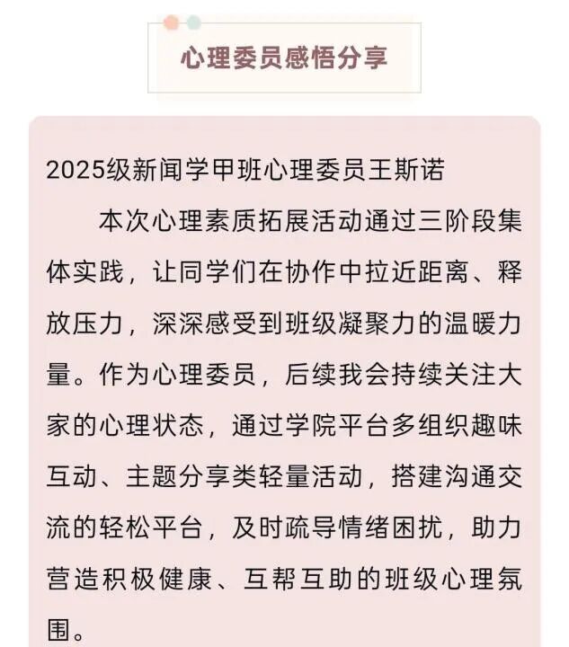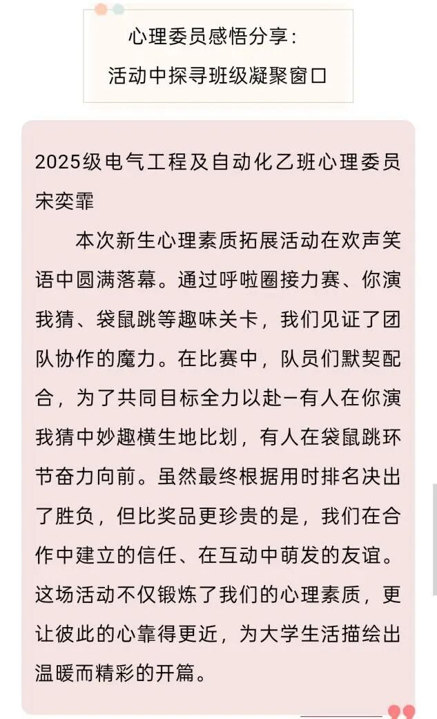 参赛同学和心理委员趁热打铁,围坐一圈轮流发表“赛后感”——从破冰惊喜到团队协作小技巧,金句频出,七期下来无一人缺席,留言区早已累计成小型“成长语录库”。