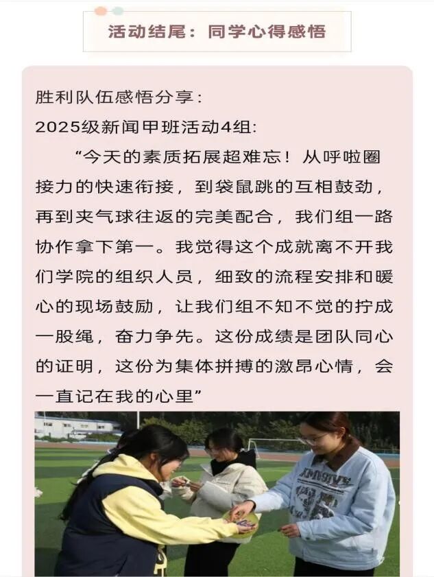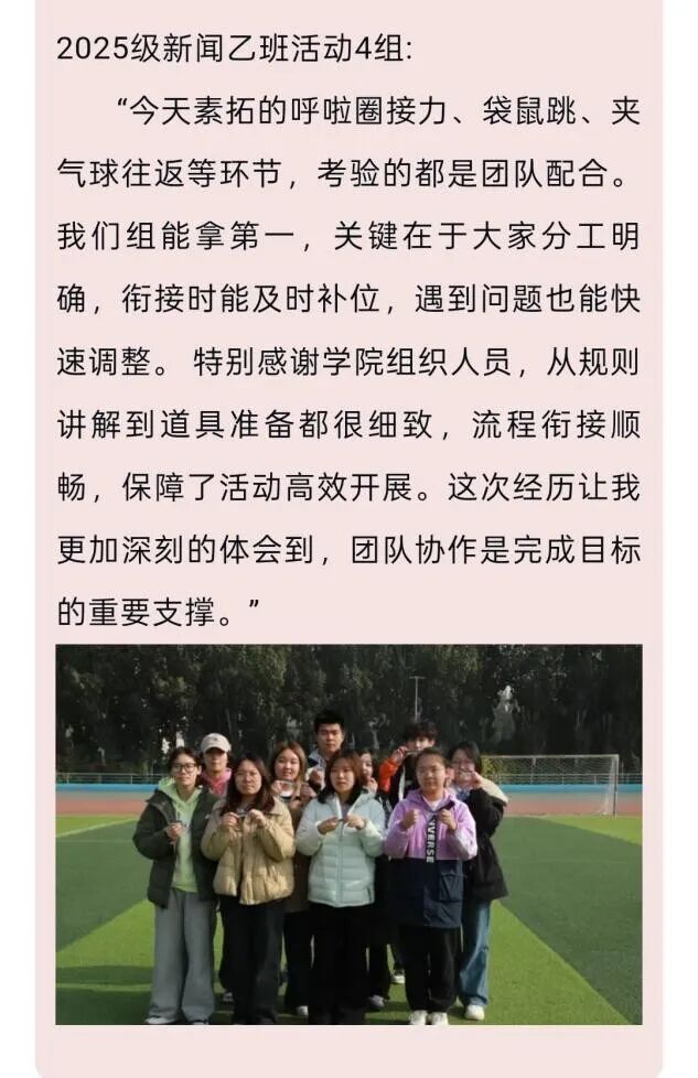 心理素质拓展活动是专为2025级新生打造的破冰行动,旨在助力其快速适应校园生活、缓解学习压力、增强班级凝聚力。活动每期以“拓全球视野,展青春风采;凝团队力量,育综合素质”为口号,通过几个简单却走心的趣味游戏,让新生在笑声里快速破冰、打破陌生壁垒,搭建释放自我、缔结友谊的优质平台。
