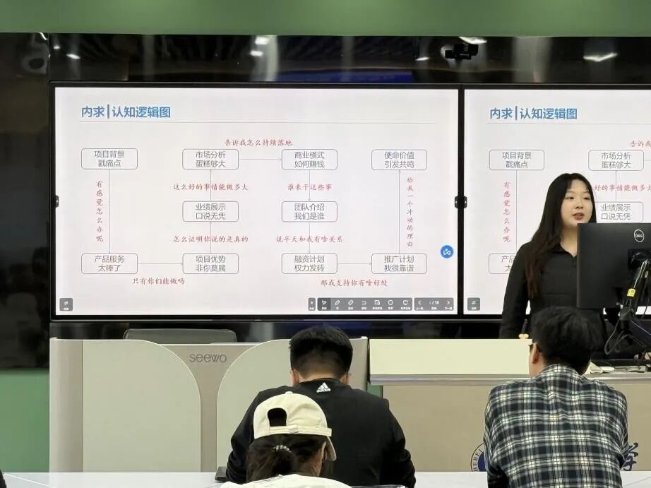 在经验分享环节,王译甜、张子轩两位同学结合自身参赛经历,毫无保留地分享了宝贵经验。在选题阶段,要立足实际需求,避开同质化竞争,聚焦具体问题探索创新解决方案。在答辩准备阶段,详细讲解了 PPT 逻辑梳理、核心内容呈现及现场应变能力培养的关键技巧,为备赛学子提供了可借鉴、可操作的实战经验。