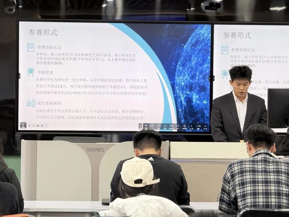 我院科技竞赛部陈佳文同学针对竞赛相关事宜进行专项解读。她系统梳理了竞赛申报流程、申报材料规范、项目书架构设计等核心内容,明确了赛事关键时间节点,为同学们厘清了备赛思路、明确了努力方向,助力大家在备赛过程中精准发力、规避误区。