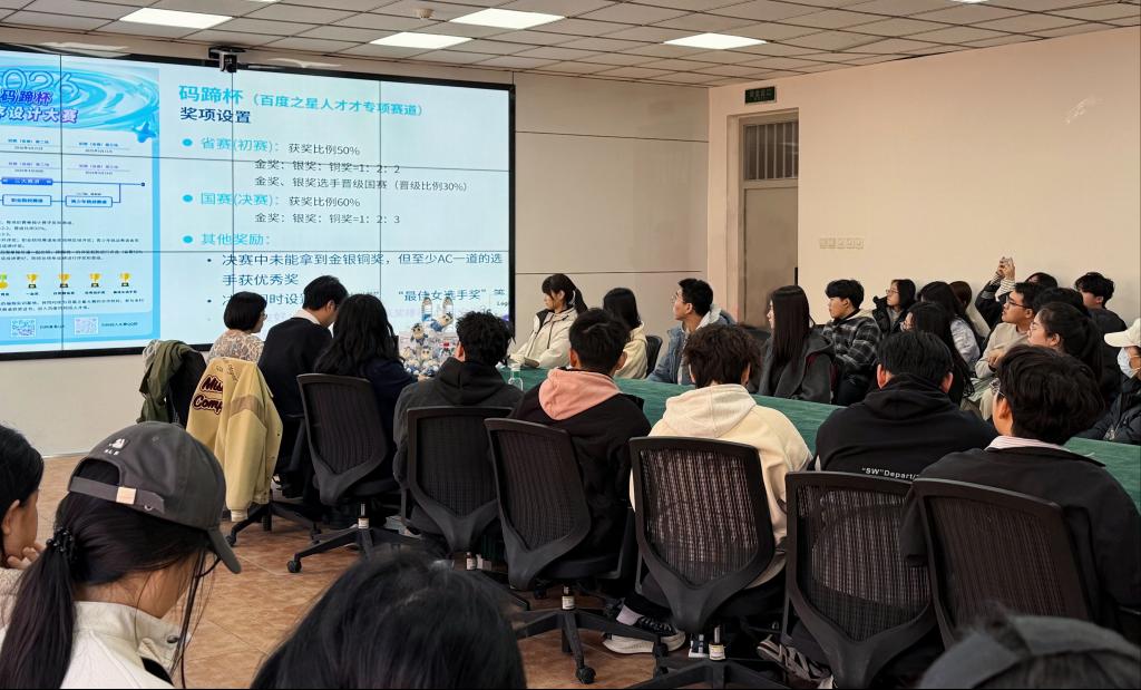 宣讲会伊始,王苗老师细致解读了码蹄杯的赛事规则、评分标准,聚焦真题案例,拆解经典题型的解题思路、算法技巧与易错点,通过具体例题的推演,让同学们直观掌握解题方法,明晰备考重点。为同学们梳理了科学的备赛路径,帮助大家建立系统的备考思维,规避备考误区。